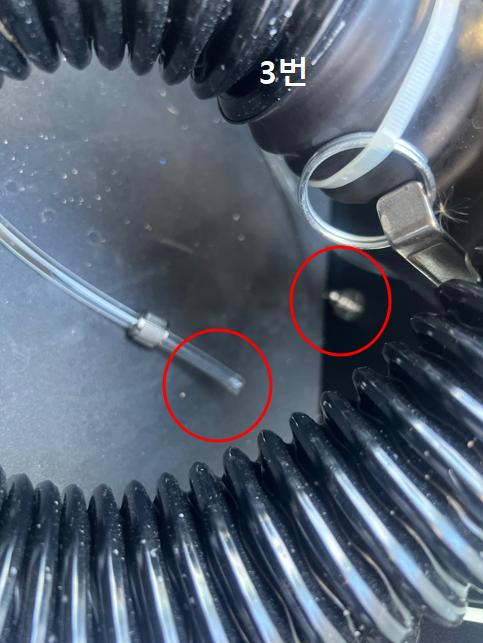 3. 에어가 찬 경우 먼저 검은색 호스(10m)를 기기에서 다 빼낸 뒤 사진상의 체결된 부분을  풀고 호스도 빼줍니다.